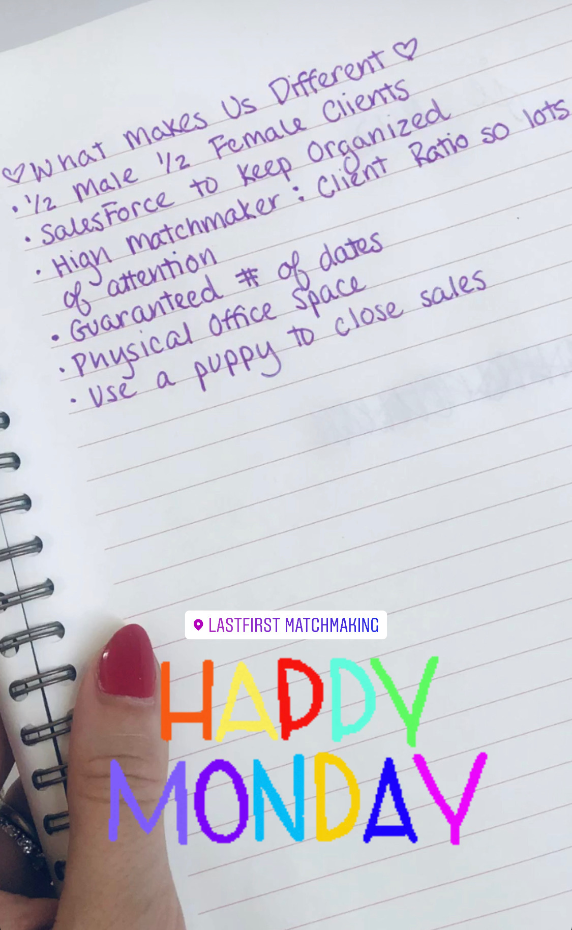10:10 a.m. Arrive at LFHQ (the LastFirst office) and spend the morning brainstorming our company rebrand. The matchmaker community is pretty collegial, however, one agency recently copied our website design, along with our entire press strategy. After the initial shock, I’m now channeling my frustration into an opportunity to freshen up our image and highlight What Makes Us Different.